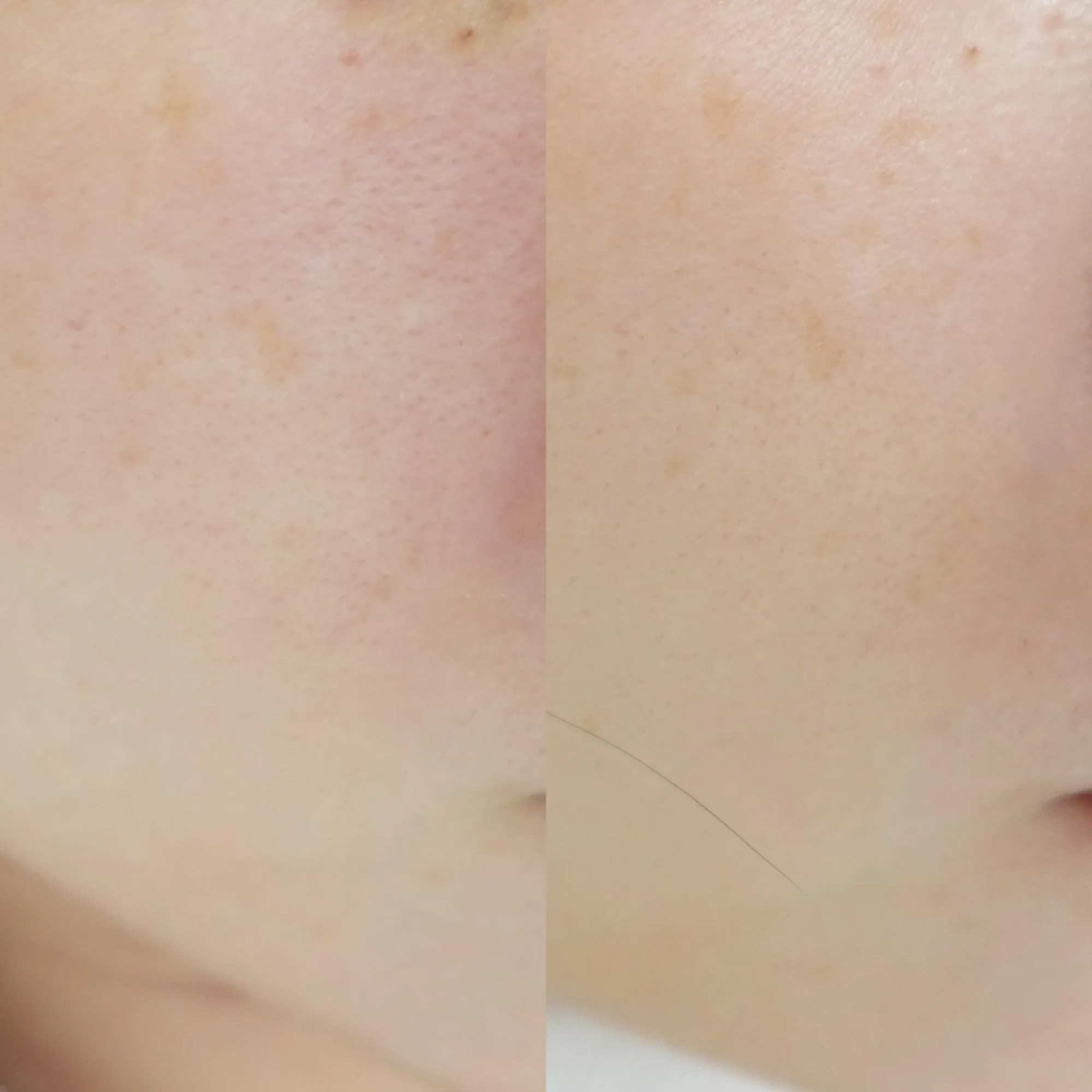 1回でも全体的に赤みやくすみが減り、きめ細やかな肌質になり、毛穴が目立ちにくくなっています。